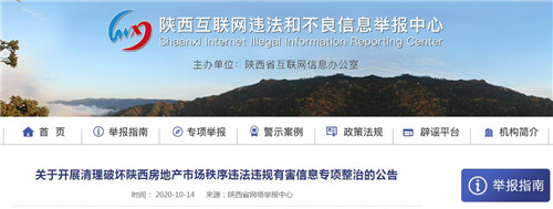 房訊網(wǎng)訊 近日陜西省互聯(lián)網(wǎng)信息辦公室發(fā)布公告,為營(yíng)造清朗的網(wǎng)絡(luò)空間,建設(shè)良好的網(wǎng)絡(luò)生態(tài),確保房地產(chǎn)市場(chǎng)穩(wěn)定,陜西省互聯(lián)網(wǎng)信息辦公室、陜西省住房和城鄉(xiāng)建設(shè)廳決定從即日起,開(kāi)展為期一月的清理破壞陜西房地產(chǎn)市場(chǎng)秩序違法違規(guī)有害信息專(zhuān)項(xiàng)整治。