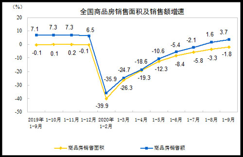 1—9月份,商品房銷售面積117073萬平方米,同比下降1.8%,降幅比1—8月份收窄1.5個百分點(diǎn)。其中,住宅銷售面積下降1.0%,辦公樓銷售面積下降16.5%,商業(yè)營業(yè)用房銷售面積下降15.3%。商品房銷售額115647億元,增長3.7%,增速提高2.1個百分點(diǎn)。其中,住宅銷售額增長6.2%,辦公樓銷售額下降15.7%,商業(yè)營業(yè)用房銷售額下降17.1%。