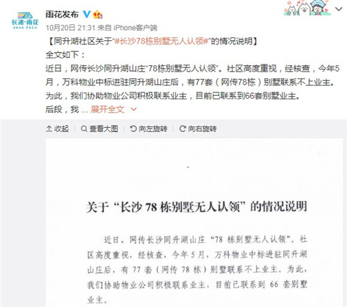20日晚間,中共長(zhǎng)沙市雨花區(qū)委宣傳部官方微博發(fā)布《同升湖社區(qū)關(guān)于“長(zhǎng)沙78棟別墅無(wú)人認(rèn)領(lǐng)”的情況說(shuō)明》。說(shuō)明指出,社區(qū)已聯(lián)系到66套別墅業(yè)主。