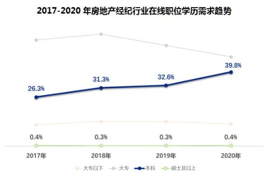 2017-2020年,房地產(chǎn)經(jīng)紀(jì)行業(yè)本科及以上人才需求占比由26.7%上漲到40.2%,房地產(chǎn)經(jīng)紀(jì)行業(yè)整體人才質(zhì)量提升需求迫切。