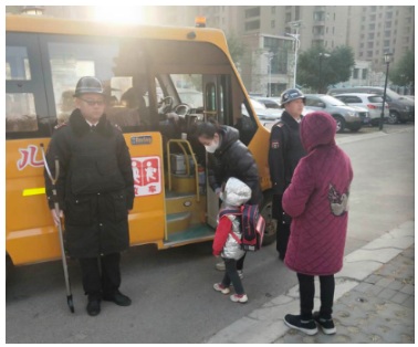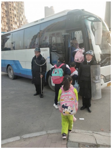 在主出入口設(shè)置了專門的“校車停靠點(diǎn)”, 同時(shí)設(shè)立秩序員專人專崗,定點(diǎn)定責(zé)護(hù)送孩子上(放)學(xué),為“祖國的花朵”們?cè)偌右话选鞍踩i”。每天清晨7:00左右,秩序員們?cè)缫颜b待發(fā)。當(dāng)孩子們陸陸續(xù)續(xù)出現(xiàn)的時(shí)候,他們用哨聲和手中的指揮棒在空中舞出一支支“交響曲”,疏通進(jìn)出車輛,進(jìn)行安全維護(hù),引導(dǎo)孩子們自覺排隊(duì)有序上車,直到校車安全離開。