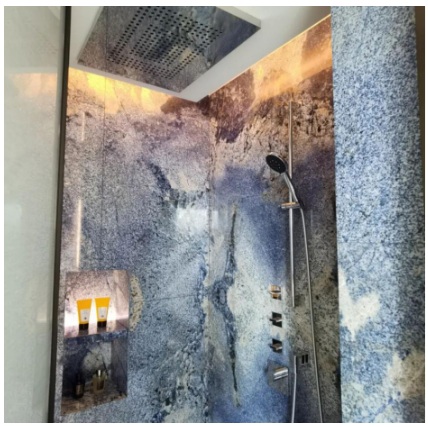 為了保證衛(wèi)生間淋浴區(qū)域的好看但同時不失品位,選擇了這種皇家藍的紋理石材