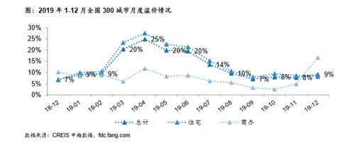 2019年 12 月,全國 300 個城市土地平均溢價率 9%,較上月增加 1 個百分點,較去年同期增加 2個百分點。其中住宅類用地(含住宅用地及包含住宅用地的綜合性用地)平均溢價率 8%,較上月減少 0.5個百分點,較去年同期增加 2 個百分點;商辦類用地平均溢價率 17%,較上月上升 12 個百分點,較去年同期上升 6 個百分點。