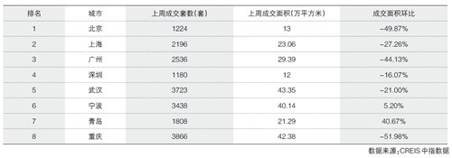 據(jù)CREIS數(shù)據(jù),上周重點監(jiān)測的21個城市成交面積環(huán)比下降28.5%。其中18個城市成交環(huán)比下降,占監(jiān)測城市的86%;同比來看,22個代表城市成交量整體上升71.7%,其中19個城市成交同比上升。