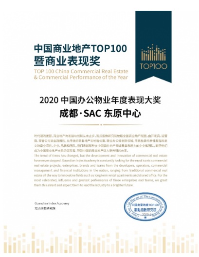 會(huì)上,觀點(diǎn)指數(shù)研究院獨(dú)家發(fā)布2020年度中國(guó)商業(yè)地產(chǎn)TOP100和商業(yè)表現(xiàn)獎(jiǎng),其中東原商業(yè)旗下成都·SAC東原中心項(xiàng)目憑借以人為本的運(yùn)營(yíng)理念和有溫度的物業(yè)服務(wù),榮獲2020中國(guó)辦公物業(yè)年度表現(xiàn)獎(jiǎng),為寫字樓物業(yè)服務(wù)行業(yè)樹立了精品標(biāo)桿。
