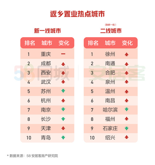 “回去還是留下”,對于“漂一族”的年輕人來說,已經(jīng)不僅僅是一道選擇題那么簡單。近日,58同城、安居客發(fā)布《2019-2020年返鄉(xiāng)置業(yè)調(diào)查報告》(以下簡稱《2020年返鄉(xiāng)置業(yè)調(diào)查報告》)。報告顯示,全國范圍來看,新一線城市重慶連續(xù)三年為返鄉(xiāng)置業(yè)的熱門城市第一位,成都、西安位列第二、三位,排名上升;其他二線城市中,徐州位列返鄉(xiāng)置業(yè)熱門城市首位,南通、合肥等城的熱度也相對靠前。
