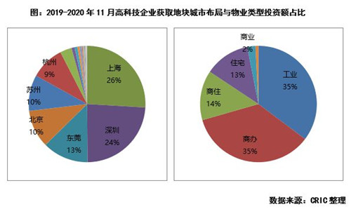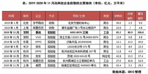 據(jù)克而瑞不完全統(tǒng)計,2020年以來至11月,包括字節(jié)跳動、阿里巴巴、華為、京東等10家高科技企業(yè)共在土地市場投資超240億元,涉及土地面積376萬平米,折合建筑面積773萬平米;而2019年該10家企業(yè)的投資額更是高達(dá)235億元,涉及建筑面積1021萬平米。
