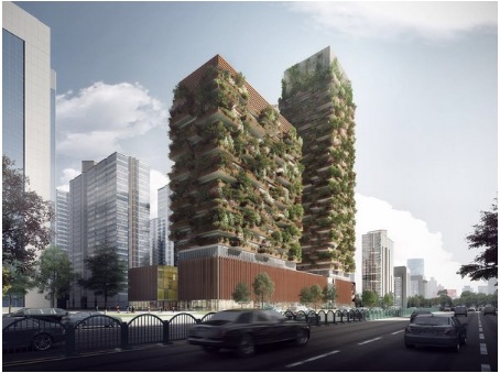 南京垂直森林位于南京浦口區(qū)明發(fā)財(cái)富中心,一座塔高200米,另一座有100米高,分別被設(shè)計(jì)成辦公室和酒店。南京垂直森林的建造過(guò)程中將米蘭垂直森林的理念完全引入兩棟塔樓之中,用沿外立面種植景觀植物直到屋頂,讓建筑充滿綠色這一方式來(lái)展現(xiàn)垂直森林的概念形態(tài),營(yíng)造出新城中的新生活體驗(yàn)。