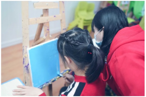 在與任教老師進(jìn)行了詳細(xì)的溝通了解后,志愿者們認(rèn)識(shí)了愛(ài)唱歌的Lilian,沉穩(wěn)安靜的阿宥,細(xì)膩又愛(ài)笑的小Shan……正逢繪畫課,志愿者們與“星兒”一對(duì)一結(jié)伴,一起繪畫,用色彩描繪五彩斑斕的世界。