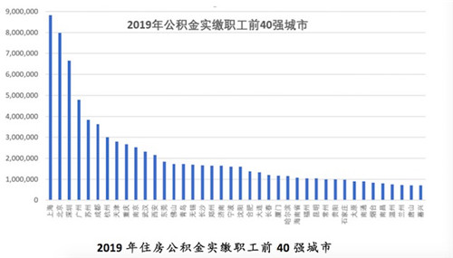 《報告》指出,2019年北京市在住房公積金歸集方面遙遙領先,是唯一年繳存額超過2000億元的城市,比第二名上海市高出了44%。上海是北京之外唯一年歸集超過1000億元的城市,年繳存額達到了1534億元。第三和第四是廣州市和深圳市,年繳存額分別達到了851億元和717億元。