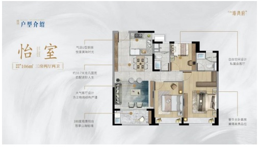 106㎡(建面約)三房,10.7米三開間朝南,陽光與清風(fēng)不請(qǐng)自來,無疑是改善戶型中的王牌選擇。180°觀景陽臺(tái),每天都可以俯瞰城市風(fēng)景,將窗外海景納入生活圈,隨心所享。