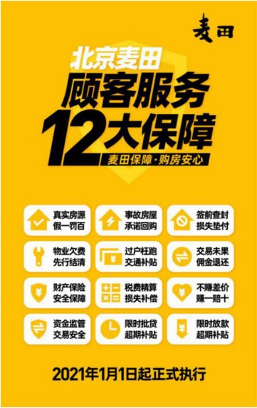 為升級(jí)消費(fèi)者服務(wù)體驗(yàn),提升行業(yè)服務(wù)品質(zhì),麥田房產(chǎn)將于2021年1月1日起,正式實(shí)施最新客戶服務(wù)12大保障(簡(jiǎn)稱“12大保障”)。此版方案將先于北京麥田落地實(shí)施,此后逐步開放至福州、廈門兩地。麥田房產(chǎn)將實(shí)現(xiàn)更全面的保障交易流程,更高效的交易以及更安全的住房按揭貸款合作產(chǎn)品,讓房屋買賣更加安心,為消費(fèi)者的權(quán)益保駕護(hù)航,進(jìn)一步助推房產(chǎn)經(jīng)紀(jì)行業(yè)服務(wù)的完善和規(guī)范。