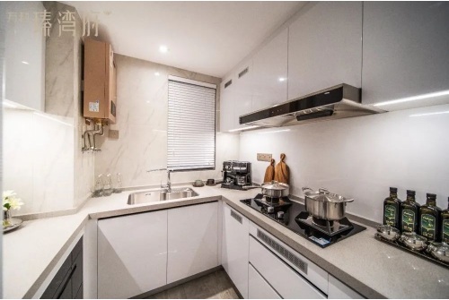 廚房為“U”型設(shè)計(jì),“U”型廚房將儲(chǔ)藏區(qū)、洗滌區(qū)、烹飪區(qū),三個(gè)廚房使用頻率較高的區(qū)域連線,形成高效的黃金三角位,小幅側(cè)身移動(dòng)即可完成烹飪工作。
