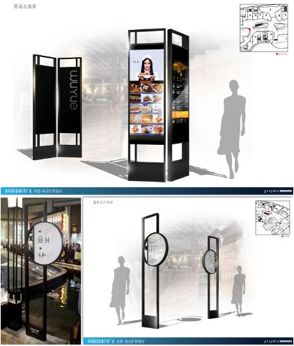 為配合這條建筑在西式商場內(nèi)的中式“姑蘇水街”,graphia革思亞以現(xiàn)代簡約的設(shè)計手法融合蘇州園景特色,利用炭黑色輕巧通透的不銹鋼“屏風(fēng)”標(biāo)志框架,配上圓形石面的“蘇州園林花窗”信息板,讓標(biāo)識成為場景的一部份,除了提供導(dǎo)視功能外,也加強了區(qū)域的主題效果,從而增加游人的體驗,為物業(yè)品牌增值。