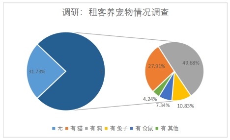 寵物不再是有房一族的專屬,伴隨著寵物經(jīng)濟(jì)的興起,越來越多租客也開始卷入“擼貓遛狗”的大潮中。問卷調(diào)研中,近7成租客已至少養(yǎng)有1只寵物,在寵物類型調(diào)研中,49.68%的租客養(yǎng)狗,27.91%的租客養(yǎng)貓。此外,兔子、倉鼠等小型寵物也開始受不少租客青睞。由于租客的獨(dú)居化、個(gè)性化的趨勢,寵物開始成為租房生活中的陪伴。而據(jù)Frost&Sullivan數(shù)據(jù)顯示,接近1億戶的養(yǎng)寵家庭花在寵物貓/狗的單只年均消費(fèi)額達(dá)到3969元。對(duì)于租客而言,租金之外還附加了對(duì)于品質(zhì)生活的投資,其消費(fèi)能力日益提升。