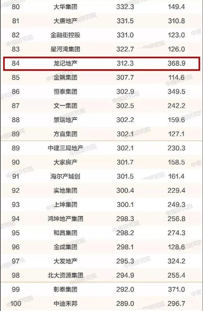 龍記地產(chǎn)銷售額位列84名、銷售面積位列60名