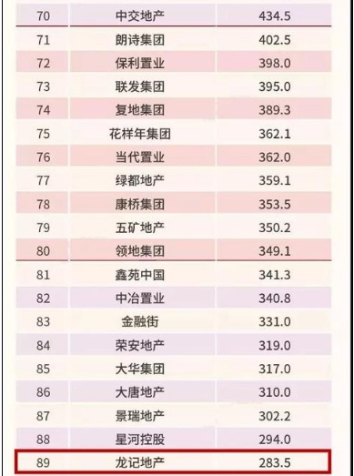 龍記地產(chǎn)銷售額位列89名,銷售面積位列68名