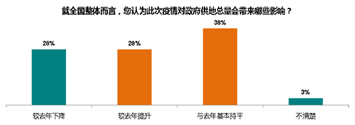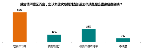 調(diào)查結(jié)果顯示,有38%的專家認為受疫情影響,2020年全國供地總量將與去年基本持平,有28%的專家認為較去年提升。綜合來看,50名地產(chǎn)專家認為2020年全國層面的供地總量將呈穩(wěn)中有升的態(tài)勢。而對于疫情嚴(yán)重區(qū)來說,有55%的專家認為2020年供地總量相比去年下降,供地總量將呈現(xiàn)穩(wěn)中有降的態(tài)勢。這可能是由于專家們考慮了相較其他地區(qū),疫情嚴(yán)重地區(qū)在影響程度和影響周期方面對全年供地總量的抑制將更加明顯。