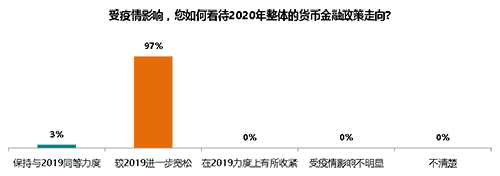 從總體的金融政策來看,調(diào)查結(jié)果顯示,有96%的專家認為受疫情影響,2020年整體的貨幣金融政策相較于2019年有進一步寬松的空間。從實際的政策動態(tài)也印證了這點,2月,人民銀行、財政部、銀保監(jiān)會、證監(jiān)會、外匯局等五部門聯(lián)合印發(fā)《關(guān)于進一步強化金融支持防控新型冠狀病毒感染肺炎疫情的通知》,重點是加大貨幣信貸支持力度,保持流動性合理充裕,進一步強化金融對疫情防控工作的支持,維護經(jīng)濟穩(wěn)定發(fā)展大局。
