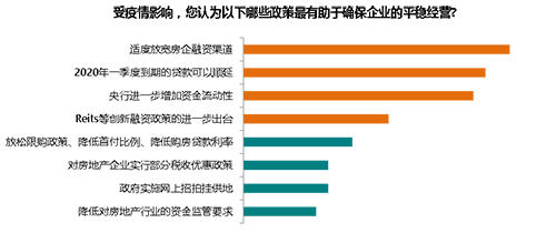 從政府政策建議方向來看,調(diào)查結(jié)果顯示,專家普遍認為適度放寬房企融資渠道、央行進一步增加資金流動性、Reits等創(chuàng)新融資政策的進一步深化、對符合規(guī)定的到期貸款進行順延政策在當(dāng)前疫情影響下最有助于確保房企的平穩(wěn)經(jīng)營?傮w來看,政策建議主要集中在確保企業(yè)的流動性方面。
