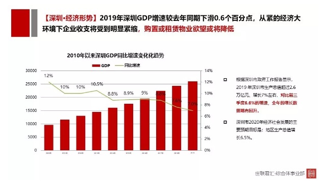 2019年深圳GDP增速較去年同期下滑0.6%,從緊的經(jīng)濟(jì)大環(huán)境下,加上2020年年初疫情影響,企業(yè)可用現(xiàn)金流預(yù)期不充足的背景下,在寫字購(gòu)置或租賃方面的支出預(yù)算將收緊,原來(lái)擴(kuò)租,提升寫字樓品質(zhì)等需求將階段性驟減。