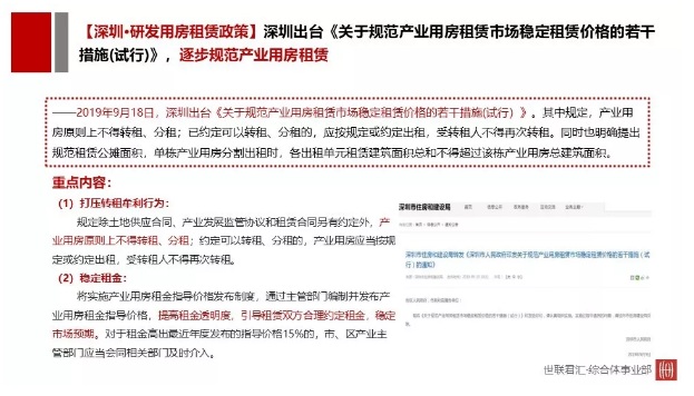 此外,前幾年伴隨著投資熱門的工改寫字樓產(chǎn)品陸續(xù)入市出臺(tái)的,是越來(lái)越規(guī)范的產(chǎn)業(yè)用房租賃政策。在2019年9月18日出臺(tái)的《關(guān)于規(guī)范產(chǎn)業(yè)用房租賃市場(chǎng)穩(wěn)定租賃價(jià)格的若干措施(試行)》規(guī)定中,進(jìn)一步明確打壓轉(zhuǎn)租牟利以及穩(wěn)定租金的要求,使得工改項(xiàng)目的利潤(rùn)空間再度壓縮,增加項(xiàng)目現(xiàn)金流壓力。