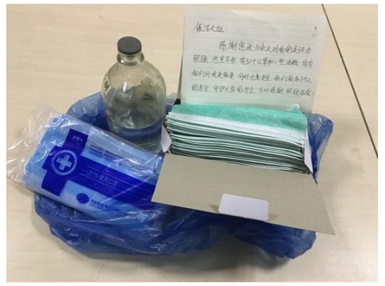 社區(qū)里一位孕婦擔(dān)心感染,不敢出門采購消毒物資,蘭正容知道后送給她一些口罩和一瓶84消毒液,并叮囑準(zhǔn)媽媽遇到困難就來找她。事后,這位準(zhǔn)媽媽向蘭正容道謝,她在自家門口放了一些物資,同時留了紙條:“保潔大姐:感謝您這10余天對我的關(guān)懷與幫助,這里有50個口罩和一些酒精,因為你們比我更需要,同時注意安全,你們放棄了個人的安危,守護(hù)大家的安全,萬分感謝!保護(hù)好自己!”