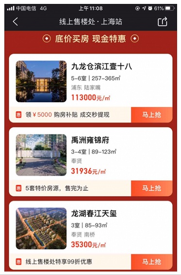 近年來,房多多已與恒大、萬科、綠地等百強(qiáng)品牌房企在全國范圍展開合作,房多多線上售樓上線當(dāng)日,60余家品牌房企、200余家經(jīng)紀(jì)公司主動(dòng)留電申請(qǐng)加入合作。目前,平臺(tái)已上線超3000個(gè)特惠項(xiàng)目,覆蓋全國百余個(gè)城市!熬上售樓處”專題會(huì)場(chǎng)推出僅短短一周,已有重慶、上海、南京、廣州、武漢等城市客戶紛紛在線支付小訂,鎖定意向房源,這也正式打響疫期在線房地產(chǎn)交易第一槍。
