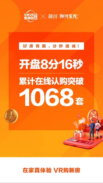 22日線上開盤當(dāng)天推出1472套房源,開盤8分16秒在線認購?fù)黄?068套,去化率達72%。在全國樓市還未解凍的今天,融創(chuàng)御河宸院項目卻在冷淡的行情中逆勢熱銷,利用貝殼VR售樓部創(chuàng)造出一個“秒殺”記錄,開啟“樓市線上小陽春”。