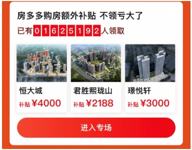 移動互聯(lián)網(wǎng)時代,線上發(fā)紅包成為營銷利器, 也有數(shù)據(jù)統(tǒng)計(jì)分析用戶看到紅包、現(xiàn)金券后的點(diǎn)擊關(guān)注率高達(dá)90%。今年以來房多多對經(jīng)紀(jì)人網(wǎng)店進(jìn)行全新改版,以新房優(yōu)惠和新房發(fā)現(xiàn)金紅包為重點(diǎn)。同時,客戶可以在網(wǎng)店的所有頁面找到各種樓盤優(yōu)惠和購房補(bǔ)貼,指定經(jīng)紀(jì)人成交就可以獲得購房補(bǔ)2000~5000元。平臺數(shù)據(jù)顯示,經(jīng)紀(jì)人通過紅包鎖客,成功率提高80%,同時使用成交現(xiàn)金券的商戶在微信朋友圈激活意向客戶的成功率比普通樓盤推廣高2.5倍。激活過返現(xiàn)紅包的客戶的成交率比普通客戶要高10倍。