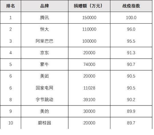 研究報告顯示,騰訊(100分)、恒大(96分)、阿里巴巴(95.5分)、京東(91.3分)、蒙牛(90.7分)、美團(90.5分)、國家電網(wǎng)(90.5分)、字節(jié)跳動(90.2分)、美的(89.9分)、碧桂園(89.7分)的品牌戰(zhàn)疫指數(shù)位居前10。其中,騰訊的捐贈規(guī)模、捐贈速度、傳播聲量均為100分,位列榜首!