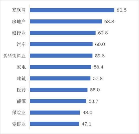 報告顯示,互聯(lián)網(wǎng)、房地產(chǎn)、銀行、汽車、食品飲料、醫(yī)藥、能源、家電、建筑、保險、零售等重點行業(yè)中,互聯(lián)網(wǎng)行業(yè)品牌戰(zhàn)疫指數(shù)最高,達80.5分,其次為房地產(chǎn)行業(yè),達68.8分,零售業(yè)品牌戰(zhàn)疫指數(shù)最低,僅為47.1分。