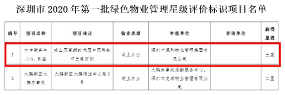 根據(jù)《<深圳經(jīng)濟(jì)特區(qū)物業(yè)管理條例>實施若干規(guī)定》(市政府令第258號)、《綠色物業(yè)管理評價標(biāo)準(zhǔn)》(SJG50-2018),深圳市建設(shè)科技促進(jìn)中心組織完成了大沖商務(wù)中心A、B座項目的專家評審與現(xiàn)場核查工作。并于2020年3月6日通過官方公示。大沖商務(wù)中心獲得了深圳市綠色物業(yè)管理項目星級評價標(biāo)識三星級認(rèn)證,這也是2020年度首批獲得“三星級綠色物業(yè)管理項目”稱號的物業(yè)企業(yè)。