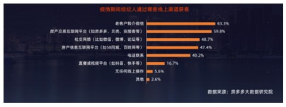 報(bào)告數(shù)據(jù)顯示,多數(shù)經(jīng)紀(jì)人在疫情期間通過線上房產(chǎn)交易服務(wù)平臺(tái)與社交網(wǎng)絡(luò)渠道獲客;其中63.3%的經(jīng)紀(jì)人 通過老客戶轉(zhuǎn)介微信獲客,59.8%的經(jīng)紀(jì)人通過房產(chǎn)交易互聯(lián)網(wǎng)平臺(tái)(如房多多、貝殼、安居客等)獲客。線上房產(chǎn)交易服務(wù)平臺(tái)與社交網(wǎng)絡(luò)“組合劍”成為疫情期間獲客利器。
