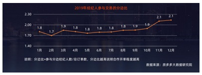 此外,跨經(jīng)紀(jì)公司的合作開單漸成趨勢, 83.3%的經(jīng)紀(jì)公司有過聯(lián)賣經(jīng)歷,其中,公司規(guī)模在1至3人的經(jīng)紀(jì)商戶合作意愿高達(dá)93.1%。據(jù)統(tǒng)計(jì)2019年12月分邊比為2.1,即成交1個(gè)訂單中就有2.1個(gè)經(jīng)紀(jì)人參與協(xié)作。