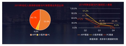 據(jù)房多多大數(shù)據(jù)研究院統(tǒng)計(jì),2019年經(jīng)紀(jì)人使用APP、小程序等移動(dòng)端作業(yè)工具管理業(yè)務(wù)的頻率遠(yuǎn)高于PC端,且仍呈現(xiàn)上升趨勢。2019年四季度APP端經(jīng)紀(jì)人用戶增速仍處于28.4%的較高增長水平,而小程序與PC端經(jīng)紀(jì)人用戶增速逐漸趨于飽和。
