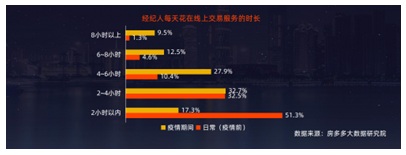 經(jīng)紀(jì)人移動(dòng)端設(shè)備使用率是PC端的10.9倍,經(jīng)紀(jì)人普遍對移動(dòng)端無縫跟進(jìn)房源與業(yè)主、及時(shí)有效的營銷、高效溝通 客戶等特點(diǎn)表示認(rèn)可,越來越多平臺(tái)和用戶認(rèn)識(shí)到移動(dòng)端作業(yè)的重要性和便利性。數(shù)據(jù)顯示,疫情期間經(jīng)紀(jì)人在線時(shí)間顯著延長,超六成經(jīng)紀(jì)人在線時(shí)長在2~6小時(shí)之間.