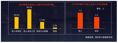 2019年,經(jīng)紀(jì)行業(yè)也面臨招人難、留人難,報(bào)告顯示2019年經(jīng)紀(jì)門店人員流入數(shù)為7.3人,流出數(shù)為5.3人,凈流入數(shù)為 2人,49.5%的經(jīng)紀(jì)公司老板認(rèn)為 2019年招人成本上升。