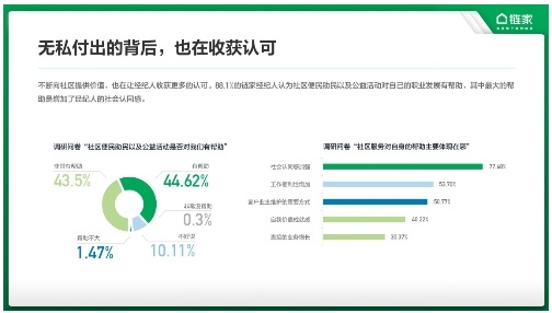 一直以來(lái),鏈家都致力于扎根社區(qū)、服務(wù)社區(qū),充分發(fā)揮門店的資源優(yōu)勢(shì),以多種多樣的便民服務(wù)項(xiàng)目助力居民生活。調(diào)研結(jié)果顯示,提供社區(qū)服務(wù)獲得了大多數(shù)鏈家經(jīng)紀(jì)人的肯定,88.1%的經(jīng)紀(jì)人認(rèn)為社區(qū)便民助民及公益活動(dòng)對(duì)自己的職業(yè)發(fā)展有幫助,其中最大的幫助是增加了經(jīng)紀(jì)人的社會(huì)認(rèn)同感。持續(xù)向社區(qū)提供價(jià)值,也在讓經(jīng)紀(jì)人收獲更多的社會(huì)認(rèn)可。