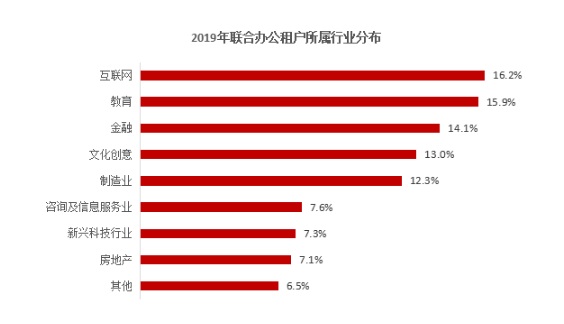 2019年聯(lián)合辦公市場經(jīng)歷了深度洗牌。年內(nèi)優(yōu)客工場IPO,氪空間因裁員、退租引發(fā)的負(fù)面輿論都對市場造成較大影響。一些品牌開始縮減項目甚至退市,但另一些品牌卻能逆勢擴張。在企業(yè)融資難度加大的背景下,聯(lián)合辦公行業(yè)逐漸由大規(guī)模擴張向精細(xì)化運營過渡,品牌之間呈現(xiàn)分化趨勢。從城市布局來看,一線城市聯(lián)合辦公市場占比高達(dá)71%,其中北京和上海是重倉區(qū),均超過30%;深圳、廣州聯(lián)合辦公的市場份額分別為4.5%、2.5%;二線城市中成都、杭州、西安相對市場份額較高。從租戶類型來看,根據(jù)iiMedianResearch數(shù)據(jù)顯示,聯(lián)合辦公租戶集中較多的前三個行業(yè)分別是互聯(lián)網(wǎng)、教育和金融,占比分別為16.2%、15.9%、14.1%,而傳統(tǒng)企業(yè)也逐漸被聯(lián)合辦公的靈活高效所吸引而逐步轉(zhuǎn)化成為聯(lián)合辦公的租戶。