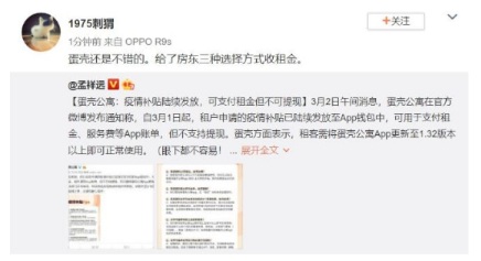 就在3月2日,蛋殼公寓官方發(fā)布消息,自3月1日起,租客申請(qǐng)的疫情補(bǔ)貼已陸續(xù)發(fā)放,可支付租金、服務(wù)費(fèi)等App賬單。