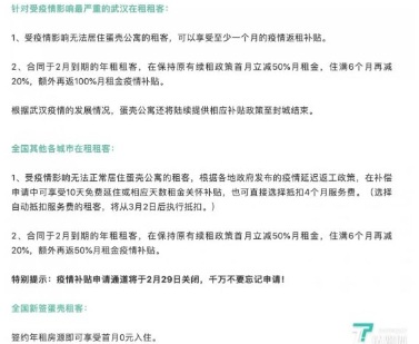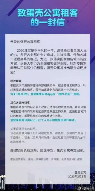 2月3日,蛋殼公寓發(fā)布公告《致蛋殼公寓租客的一封信》,公布疫情期間對(duì)全體租客的補(bǔ)貼政策。這是目前國(guó)內(nèi)分散式長(zhǎng)租公寓企業(yè)中首家正式公開發(fā)聲,為疫情期全體受影響的租客提供租金補(bǔ)貼的企業(yè)。