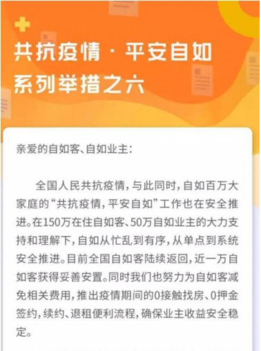 這是疫情以來自如發(fā)布的第六次抗疫舉措。此前其推出的多項舉錯中包括:協(xié)助社區(qū)和相關政府部門收集租客返程信息;按時為業(yè)主支付租金;為全國150萬在住租客減免2月50%服務費;為近5萬武漢租客減免2月一半租金及全月服務費約3000萬元;為符合相應條件的返程租客提供安置房源;上線短續(xù)優(yōu)惠、0押金簽約等。