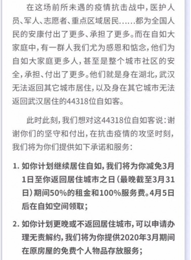 為身在湖北仍無法返回其它城市以及身在其它城市仍無法返回武漢,且計劃返程后繼續(xù)租住自如的租客減免部分租金服務費;為計劃3月31日后返回或不返回的,提供無責解約服務,同時提供3月期間原房屋的免費個人物品存放服務;自如管理層自愿進行一季度降薪20%-50%,合并用于補貼上述費用減免舉措。