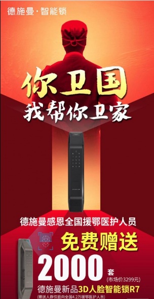 陽(yáng)春三月,英雄歸來(lái)。為了能以實(shí)際行動(dòng)感恩馳援“疫”線的全國(guó)援鄂醫(yī)護(hù)人員,德施曼主動(dòng)作為,特發(fā)起“你衛(wèi)國(guó),我?guī)湍阈l(wèi)家”公益行動(dòng)。由于浙江本身也是重疫區(qū),企業(yè)受疫情沖擊較大,結(jié)合現(xiàn)有供應(yīng)鏈和產(chǎn)能的實(shí)際情況,德施曼針對(duì)有智能鎖需求的援鄂醫(yī)護(hù)人員,首批免費(fèi)贈(zèng)送2000套新品3D人臉智能鎖R7,1年之內(nèi)均可有效領(lǐng)取,下單后一個(gè)月內(nèi)陸續(xù)完成發(fā)貨,同時(shí)享受免費(fèi)安裝待遇。