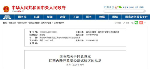 房訊網(wǎng)訊 4月13日,國務(wù)院發(fā)布《國務(wù)院關(guān)于同意設(shè)立江西內(nèi)陸開放型經(jīng)濟(jì)試驗區(qū)的批復(fù)》,同意設(shè)立江西內(nèi)陸開放型經(jīng)濟(jì)試驗區(qū)(以下簡稱試驗區(qū)),試驗區(qū)建設(shè)總體方案由國家發(fā)展改革委印發(fā)。