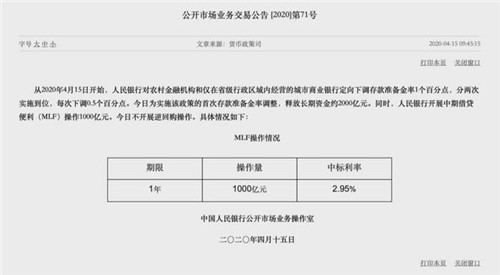 4月15日,央行按慣例開(kāi)展每月新作中期借貸便利(MLF),本次1年期MLF新作規(guī)模1000億元,中標(biāo)利率2.95%,較此前下調(diào)20個(gè)基點(diǎn)(BP)。這是繼3月30日逆回購(gòu)利率“降息”20個(gè)基點(diǎn)后,時(shí)隔僅半個(gè)月,又一政策利率“降息”。