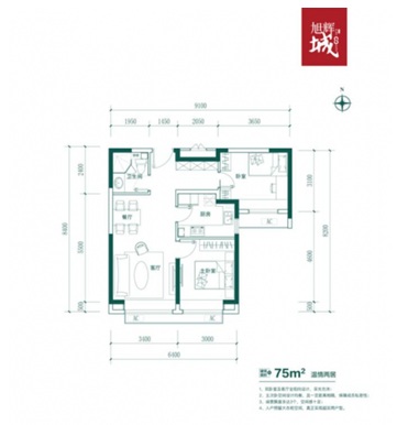、偌词棺钚粜75㎡兩居,9.1米南向面寬,三面朝南,3飄窗設計,總價只有220萬起。