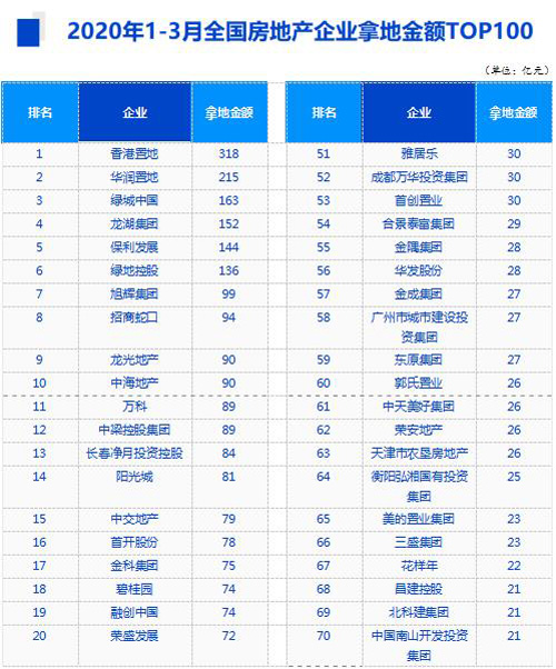 近日,中國指數研究院發(fā)布《2020年1-3月全國房地產企業(yè)拿地排行榜》。