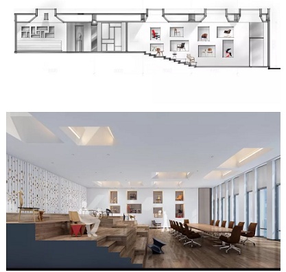 我們最終把這里設(shè)計(jì)成了一個(gè)多功能廳,具有展廳的功能。放置了很多100年以來(lái)經(jīng)典款的椅子,它們有些是展品,只可遠(yuǎn)觀;有些放在階梯上,客人可以坐下親身體驗(yàn),體驗(yàn)好的設(shè)計(jì)對(duì)感官、對(duì)觸覺(jué)的影響。